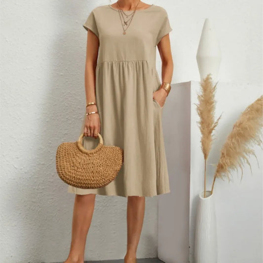 Women's Dresses 2025 Summer Fashion Casual Dresses Women Loose Mid Length Over Knee Dress New Short Sleeve Solid Dress Woman